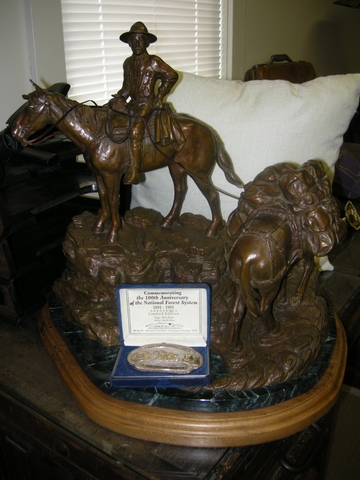 Charlie Norton bronze commemorating 100th Anniversary of National Forest Service, “The Ranger” with matching belt buckle and the original saddle used for making of the bronze. Bronze is #31 of 100
