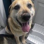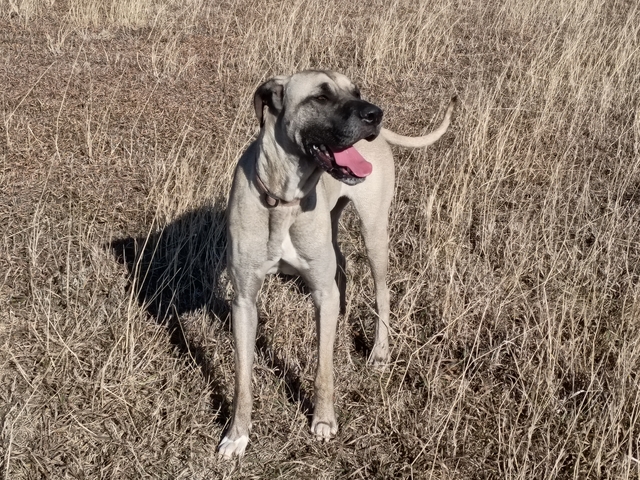 Under a year old great Dane cross, we estimate 10-11 months old. Her brother has found a home so she is left. They were found roaming and we now have permission to post them for new homes. She does have a few cuts and scraps from roaming, but is overall healthy and happy.
