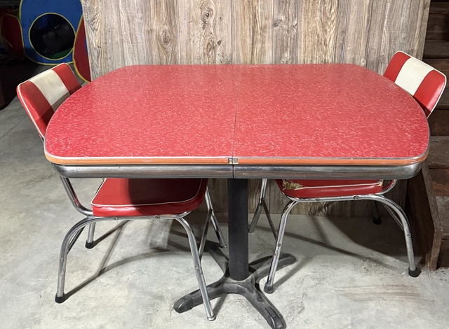 I have a decently nice red 1950s retro with 2 chairs that are NOT very good but useable has a little damage to one end of the table as seen in photos. Asking $75 or make offer can deliver in garden city Holcomb area maybe a little further.