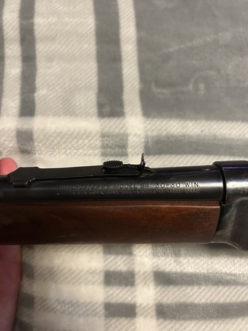 30-30 Lever Action. Rust on receiver, no pitting. Wood in decent shape other than wear by the butt plate. Gun has a smooth action and shoots great. Early 70s model.