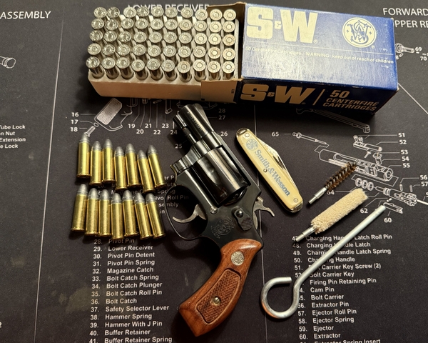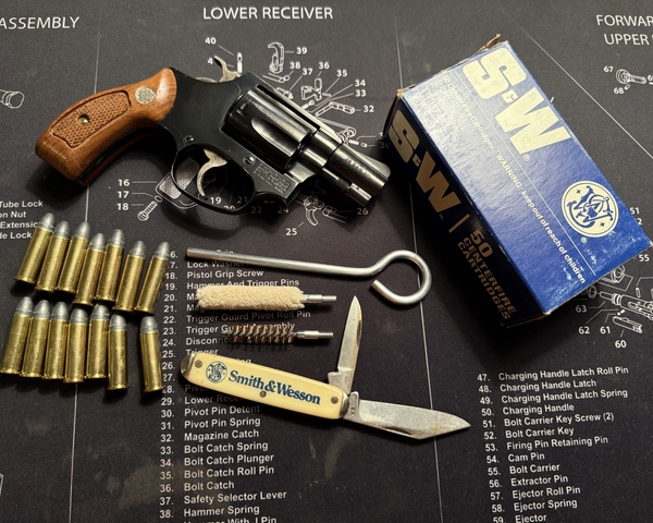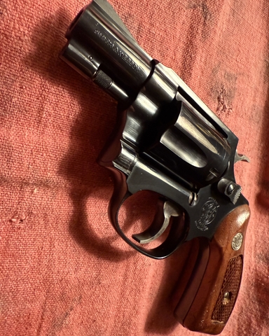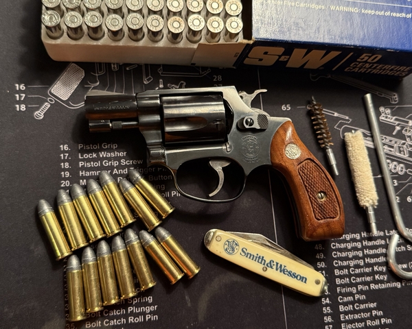 Excellent condition pre-lock Smith & Wesson model 36–2 snubnose revolver in 38 special, blued finish and original wooden grips. Full 50 round box of vintage S&W 38 special +P ammo, S&W pocket knife, cleaning kit, 14 rounds of loose 38 special ammo. No trades except maybe a Randall knife. Price lowered to $650 cash for gun only or $700 for everything firm. No shipping. No holds, first come first served. Meet near Wichita only. Thanks.
