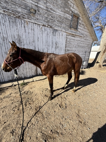 Pete has about 15 rides on him, rides around pretty good. About 15 hands tall straight legged and built good. 100% sound, I have checked cows on him but can be spookish at times but Will be a nice tall and athletic horse. I think he would excel in the barrel pen. Just needs time which I do not have at the moment. Located in garden city ks 2,500 OBO you can reach me at 785-7three5-nine3seven5