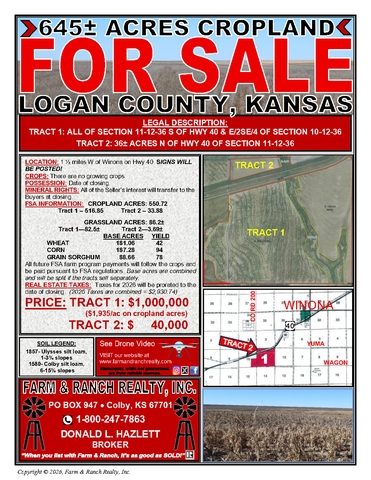 This 645± acre tract of cropland and grassland is located in Logan County, Kansas, approximately 11/2 miles west of Winona on Highway 40. Signs will be posted. The property consists of approximately 550.72 cropland acres, with Tract 1 containing 516.85 acres and Tract 2 containing 33.88 acres, along with approximately 86.2± grassland acres, including 82.5± acres in Tract 1 and 3.69± acres in Tract 2. There are currently no growing crops, and possession will be given at the date of closing. All of the seller's interest in the mineral rights will transfer to the buyers at closing. According to FSA records, the base acres and yields are as follows: wheat has 181.06 base acres with a 42 bushel yield, corn has 187.28 base acres with a 94 bushel yield, and grain sorghum has 88.66 base acres with a 78 bushel yield. All future FSA farm program payments will follow the crops and be paid pursuant to FSA regulations. Base acres are combined for the property and will be split if the tracts sell separately. Real estate taxes for 2026 will be prorated to the date of closing, with 2025 combined taxes totaling $2,930.74.