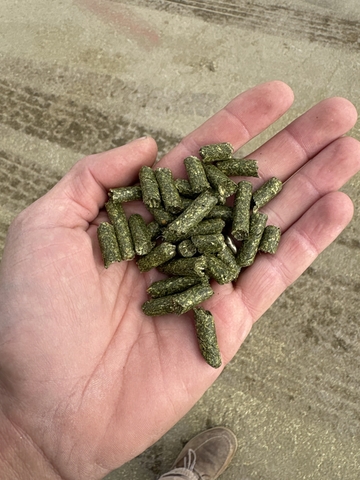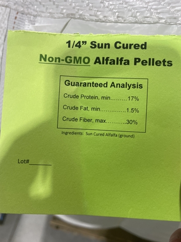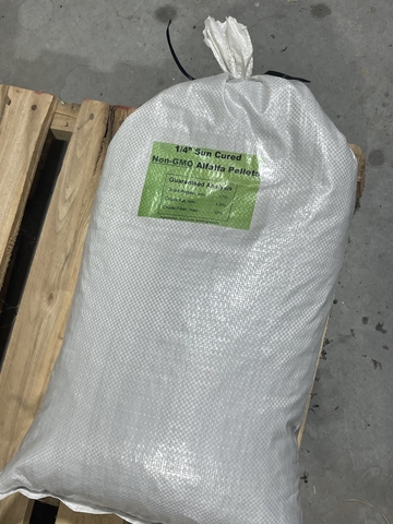 We have 1/4 Alfalfa pellets in super sacks and also 25lb bags . Super sacks have between 2.000 to 2,150 lbs each . Price per ton is $375. 25 lb bags are $6 each . Can also make grass pellets , ddg pellets , etc .