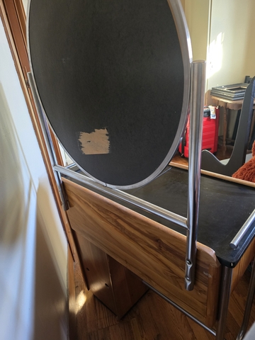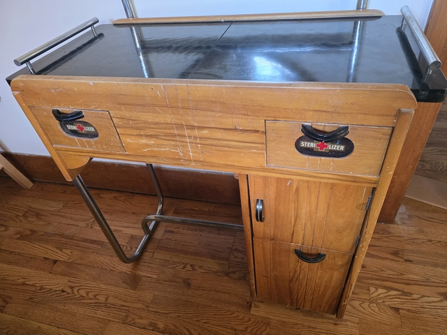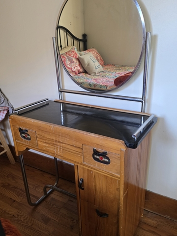 A very unique piece! Used in a barbershop or hair salon in the 1930 to 1950. All original! Top slides open for storage area. Drawers all work. Mirror in good shape. You won't find one like this in this good of shape very easily! Works great as a vanity!! $1000 cash firm. Must pick up in Colby. 33.5" wide x 62" tall x 17" deep. Serious inquiries only.