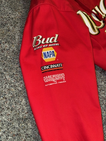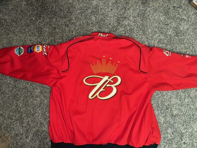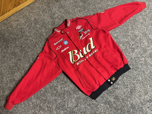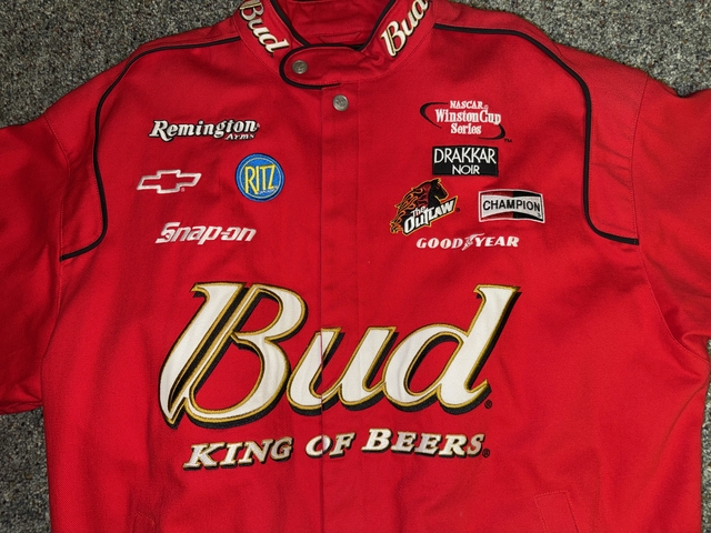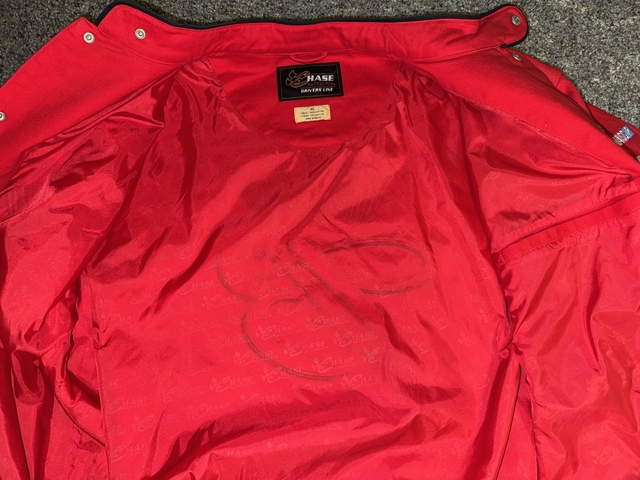 This Dale Jr. NASCAR racing jacket, by Chase Authentics, is LIKE NEW, in IMMACULATE condition. Shell: 100% cotton. Lining: 100% nylon. Size: XL. Has inside pocket as well as 2 external pockets. Snap closure. Dry-cleaning is highly recommended for proper cleaning and preservation. (It has never been dry-cleaned.) It was bought new in 2003 or 2004. Worn less than a dozen times, never exposed to inclement weather conditions or smoke. It just hangs in the closet.