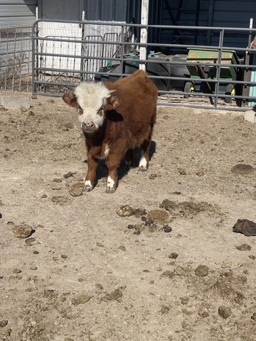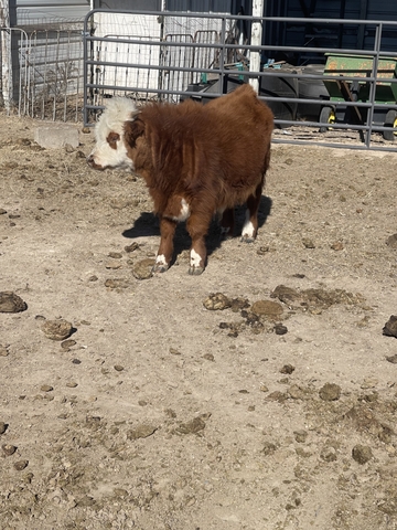 Our miniature Hereford bull that was born 5/24 needs a new home... he should weigh about 500-600 lbs. and about 40-42 in. tall at maturity, he comes to a feed bunk and is very calm in nature. $2000 obo. Thx. Shane (620)629-0469