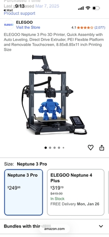 ELEGOO Neptune 3 Pro 3D Printer, Quick Assembly with Auto Leveling, Direct Drive Extruder, PEI Flexible Platform and Removable Touchscreen, 8.85x8.85x11 inch Printing Size. Bought new in March. Works great, just thinking about upgrading. Call or text 785534782five.