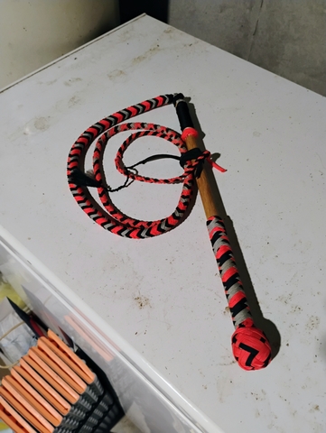 I make custom whips from parachord. I make either the classic bullwhip or austrailian stock whips(see pic no. 2). If you would like one message me here or call, give me your favorite colors and a desired length and I get right on it. DISCLAIMER: No I will not make you a 20 or a 25ft whip because YOU won't be able to crack it. 7eight5-two0two-zero66six.