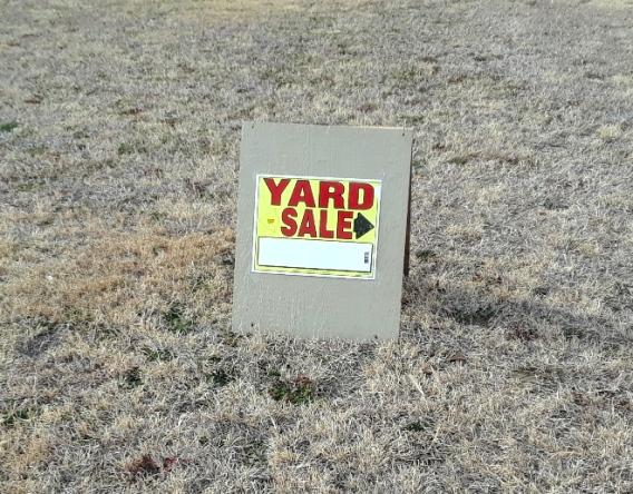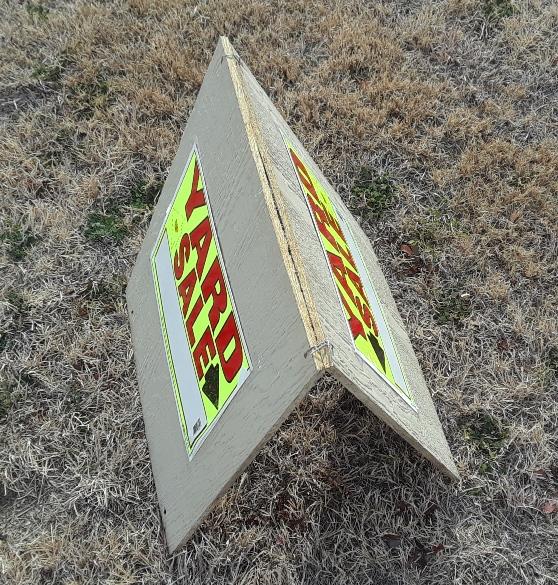 Yard Sale Sign - $7.00 Selling an A-Frame 14” x 11” Yard Sale Sign & base with a plastic sign. Four holes in the bottom of the base to drive in metal rods or 7” nails to keep it secure to the ground so it won’t blow over. The base is made out of wood. Blank section on the actual to add your date and time of your sale.