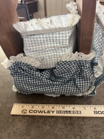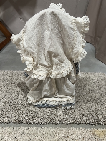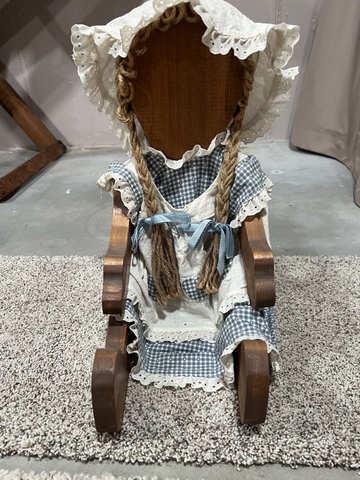 Wooden doll with burlap braids and movable arms. Cloth hat, dress with apron and ribbons added to her hair.
