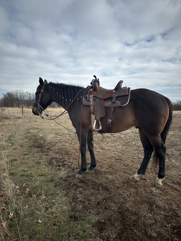 Cruz leads, loads with encouragement(he had a bad experience), ties, picks up his feet, and stands to be shod. I keep front shoes on him as he tends to get tender on his fronts when it's wet out.. He w/t/l when asked, and will w/t/l circles, backs when asked, and has a good stop