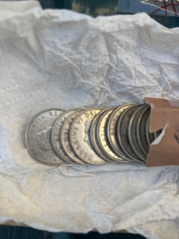 Canadian 50 cent coins 80% silver have 22 . Equals 6.6 troy oz wich would be $75.75 per oz. 785-432-3799 1942-1962 coins very good shape except one