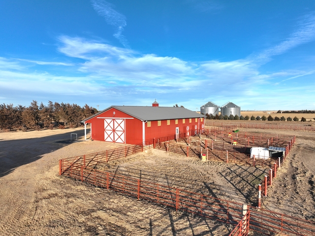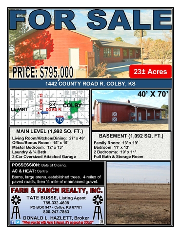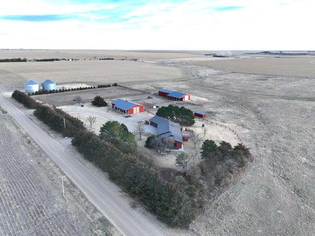 Discover this dreamy country home situated on 23± acres outside of Colby, Kansas, offering space, comfort, and a peaceful rural lifestyle. The main level features 1,992 square feet of thoughtfully designed living space with an expansive open-concept living room, kitchen, and dining area measuring 27' x 49', ideal for entertaining and everyday living. The primary bedroom offers a comfortable retreat at 12' x 13' and includes a 15' x 19' office or bonus room located directly off the primary, perfect for a private office, nursery, sitting room, or workout space. A conveniently located laundry area and 3/4 bath complete the main level. An oversized two-car attached garage adds exceptional storage and convenience. The finished basement provides an additional 1,092 square feet and includes a cozy family room (13' x 19'), a bedroom (11' x 13'), two additional bedrooms (10' x 11' each), a full bath, and a storage room, making it ideal for guests or a growing family. Outside, the property is complete with barns, a large arena, and established trees, creating an excellent setup for livestock, horses, or hobby farming. Access is easy with just four miles of paved roads followed by a half mile of well-maintained gravel, offering both privacy and convenience.