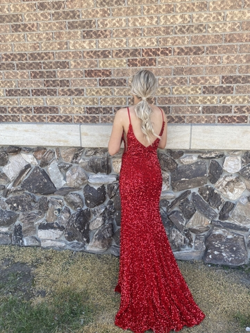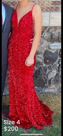 Red sequin formal dress. Size 4. Worn once. No major alterations done, just taken in a little in the underarm, could be let back out if needed.