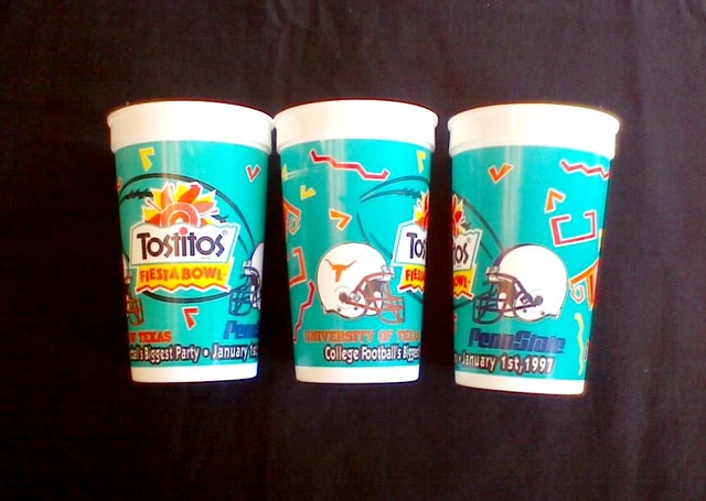 1997 Tostitos Fiesta Bowl Cups - $10.00 Selling 3 collector style 22oz cups from the Tostitos Fiesta Bowl held on January 1, 1997 held at Sun Devil Stadium in Tempe, Arizona (Phoenix). The (10-2) Penn State Nittany Lions defeated the (8-4) Texas Longhorns, 38-15. Penn State was ranked 7th in nation and although Texas was only ranked #23 at the time, they had just come off an upset win in the Big 12 conference championship against #6 ranked Nebraska. $10 for all 3 cups.