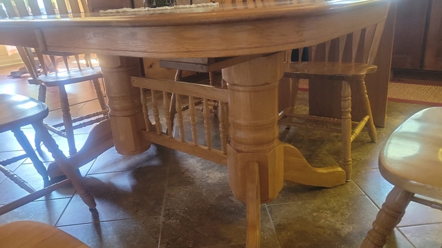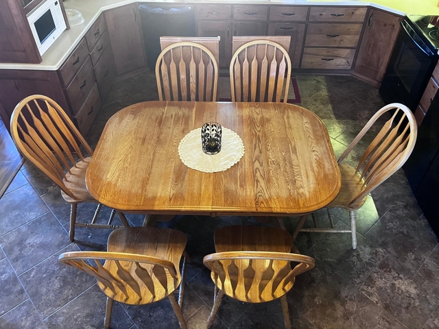 Purchased new in 2004. One chair has a broken slat but otherwise in pretty good condition. 6 chairs, and 2 extra leaves. Seats 10 with the leaves in. Leaves can store in the table under the top.