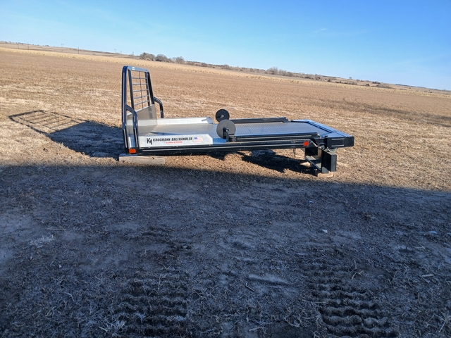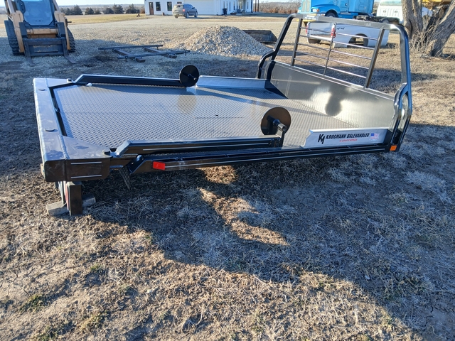 Krogmann long bed single wheel balehandler 12v pump model shown. Can do engine driven pumps as well. Tool boxes, 3rd spool, remote and work lights can be added on to most beds. We are a Krogmann dealer, but can service all brands of bale beds.