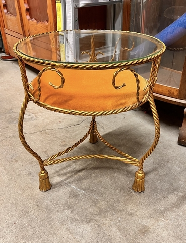 Have an Exceptional Antique Italian Gilt Metal Three-Leg Tole & Tassel Round Accent Glass Top End Table. This is a Hollywood Regency Gilt Tole Rope & Tassel Metal Three-Leg Table W/Round Glass Top W/Gold Velvet Upholstered Cushion, made around 1920s!! Attached to one leg is a metal tag that reads “MADE IN ITALY”. Measures 20” Tall, 17.5” Diameter. (NO HOLDS)(No Deliveries)(CASH ONLY) LOCATED IN HAYS, KS (REDUCED)