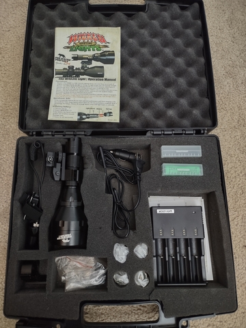 Wicked Lights night hunting light kit. Model 403iC, includes 1-red bulb, 2-green bulbs, 2-white bulbs, 2 rechargeable batteries, charger, light with on/off tailhousing and pressure switch, and mount for either 1" or 30mm scope tube. Used very little, in excellent condition. $150