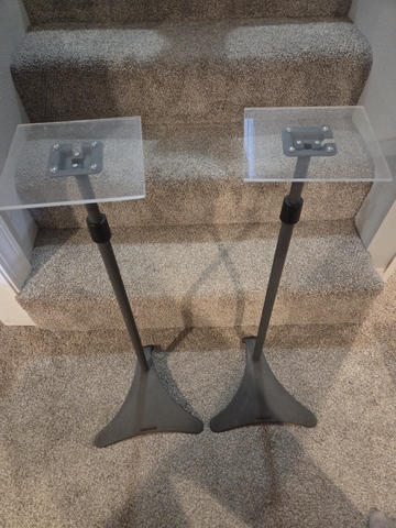 2 Adjustable speaker stands. Can attach some speakers to stand or use the plexiglass shelf I made. (Puppy in picture is not for sale... today. Might entertain offers. Lol!!)