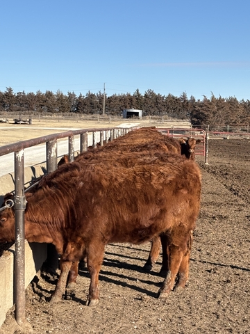 Approx 30-32 head high quality red angus commercial replacement heifers from reputation herd. Home raised 750-800#, tract checked, Bangs vac'd, vet checked open. Presently being fed a maintenance/grow bunk ration. Cross Diamond, Whisman Red Angus, and Ludvigson genetics. Selling as a minimum package of 20 all the way to 30-32. Buyer will get to hand pick what they want or take the whole package. Available for inspection and purchase 2/1, but call or check for updates as they could be available sooner.