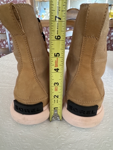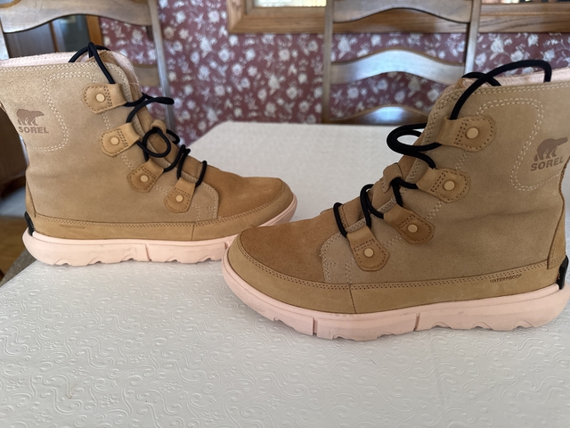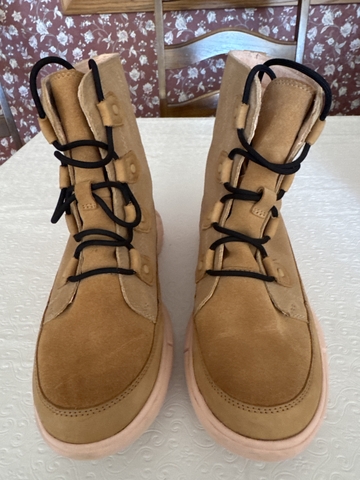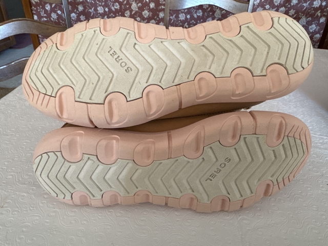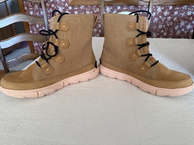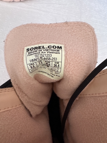 Tan upper suede with pink soles by Sorel. Size 9.5. Only wore once. No spots on suede. They have a soft pink like insulation inside. They are in very good excellent condition.