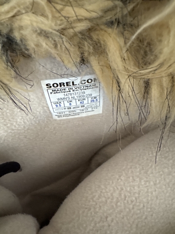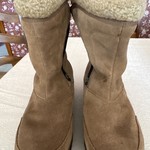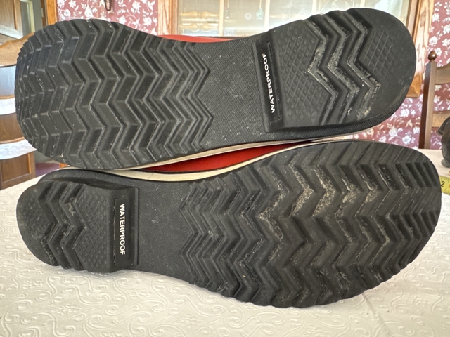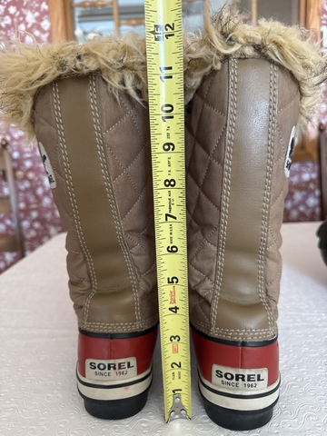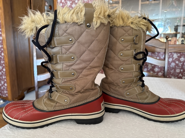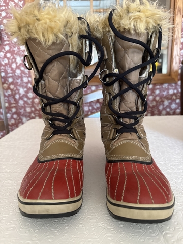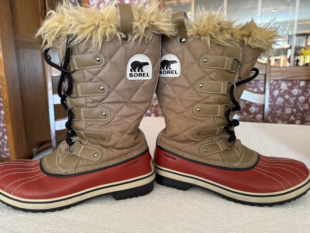 Red with tan quilt like waterproof material. Fur at top of cuff with tabs to help pull boots on. Has a soft insulating material inside. Size 9.5. Worn very little. These are in very good excellent condition.