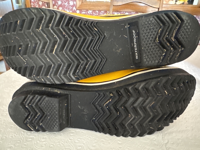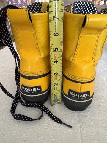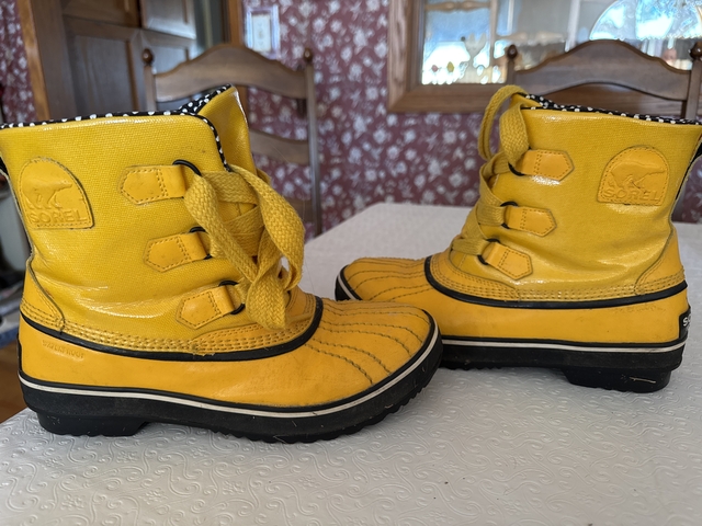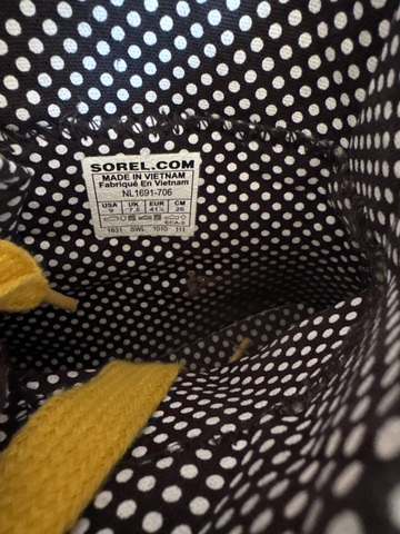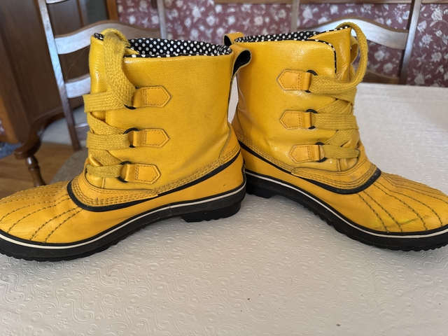 Yellow patent leather with black and white polka dot interior. These do have the black and white polka dot extra laces. Size 9. The tops of toe area are scuffed, may come off have not tried. Have been worn a few times. In good condition.
