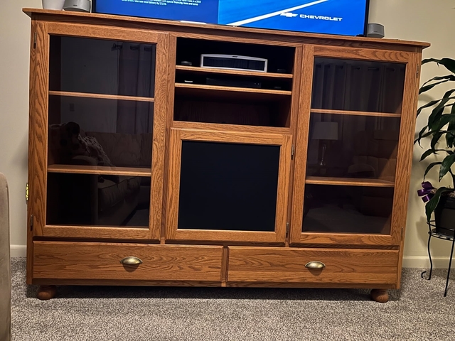 Built by Crown Cabinets in Abilene, Kansas. 2 bottom pull out drawers for storage. Center storage or subwoofer cabinet. Dimensions are