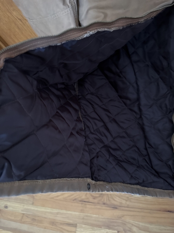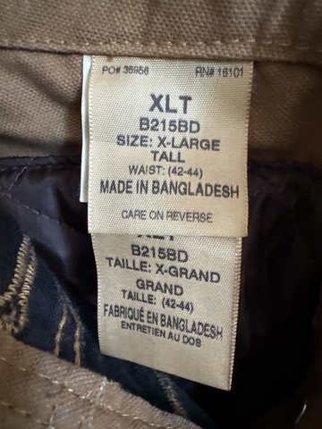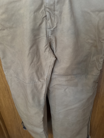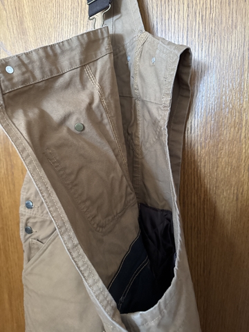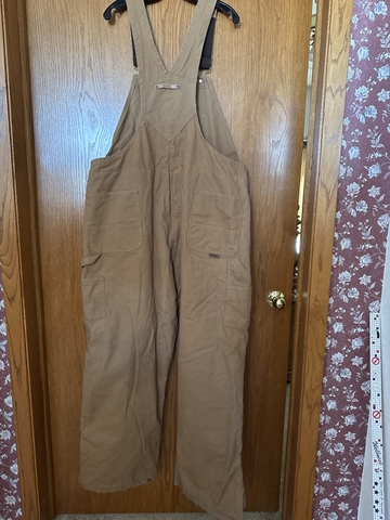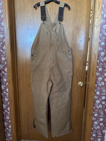 Tan canvas un insulated bib with waist to legs quilt insulation. The straps have partial elastic for adjustment. One way functional zippers on legs. Double knee. Lightly stained around thigh to knee area. Bib area has no zipper. 2 buttons on side to pull bib up and down. Painter style on legs for pockets. Big front pockets are lined. These are in very good condition considering the light stains previously mentioned. Measurements provided. Size XLT (42-44)
