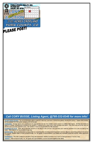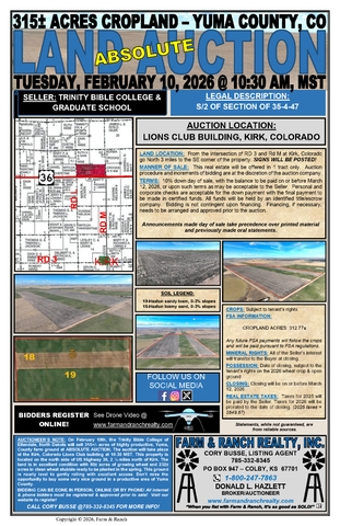 ABSOLUTE LAND AUCTION – Highly productive Yuma County, Colorado farmland offering 315± acres (S/2 of Section 35-4-47) to be sold in one tract only. The auction will be held February 10th at 10:30 MST at the Lions Club Building in Kirk, Colorado, with bidding available in person, online, or by phone (prior registration and approval required). The property is located north of U.S. Highway 36, approximately 2½ miles north of Kirk, or from the intersection of RD 3 and RD M, go north 3 miles to the southeast corner of the property; signs will be posted. This nearly level to gently rolling farm features excellent access and strong productivity, with approximately 80± acres of growing wheat and 232± acres of clean wheat stubble ready for spring planting. FSA cropland acres total 312.77±, and any future FSA payments will follow the crops per FSA regulations. All of the Seller’s mineral interest will transfer to the Buyer at closing. Crops and possession are subject to tenant’s rights on the 2026 wheat crop and open ground. Terms require 10% down the day of sale with the balance due on or before March 12, 2026, or upon such terms as acceptable to the Seller. Personal and corporate checks are accepted for the down payment; final payment must be in certified funds. All funds will be held by an identified title/escrow company. Bidding is not contingent upon financing, and any financing must be arranged prior to the auction. Seller will pay 2025 real estate taxes, and 2026 taxes will be prorated to the date of closing (2025 taxes: $649.67). Announcements made the day of sale shall take precedence over all printed and prior statements. This is an outstanding opportunity to purchase quality, well-maintained farm ground in a highly productive area of Yuma County. For additional information, contact Cory Busse at 785-332-8345.