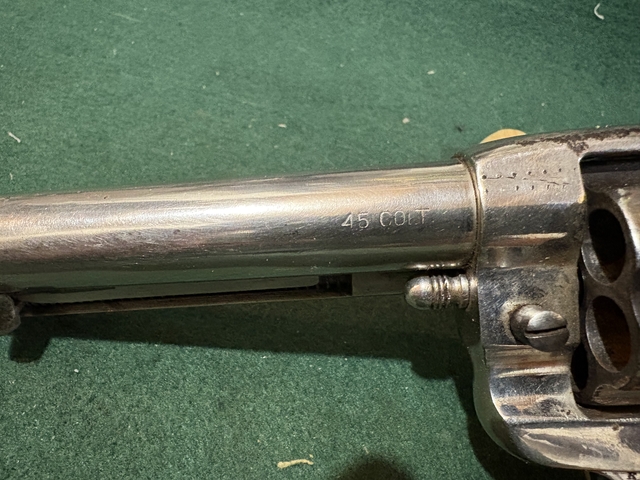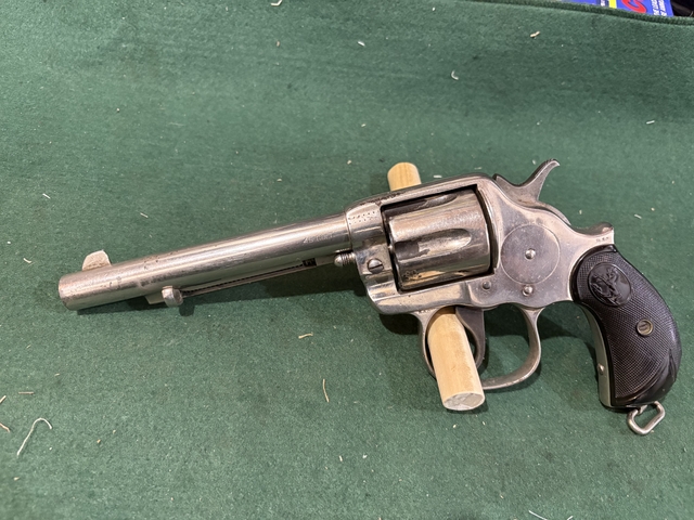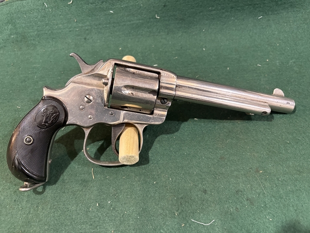 Here is a Colt 1902 (Philippine Constabulary) that is similar to the model1878 except has oversized trigger guard and long trigger with an 1878 type cylinder with long flutes double action nickeled with a 6 inch barrel in caliber 45 long Colt. It has the R.A.C. Inspection marks on the trigger guard and US stamp on the frame. Overall condition is good with some nickel flaking mainly on the cylinder and a small chip on the lower left grip. It functions in both single and double action. Nice collector Colt with only 5000 made in this variation. You can call text or message me 78five-6one4-13six8 asking $1850 cash only may negotiate some thanks for looking.