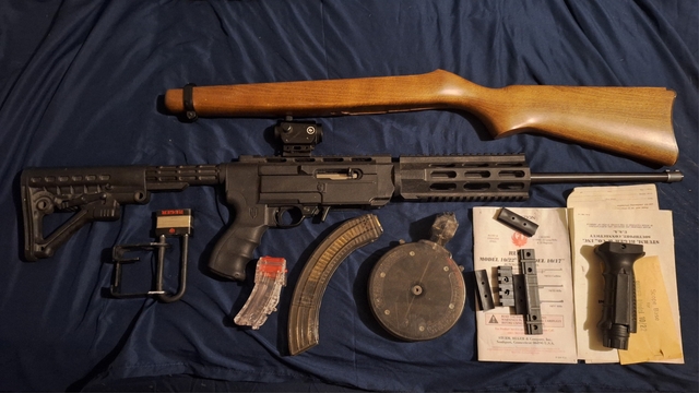 Very little use. Archangel stock aswell as factory. Crimson trace red dot, 50 round drumb, 30 &15 round magazines..