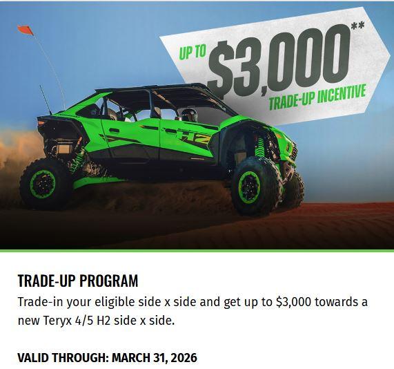 Update your current ride with Kawasaki's Trade-Up Incentive: add an additional $2,500 to your trade-in value now through 3-31-2026.