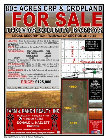 Excellent opportunity to purchase an 80± acre tract in Thomas County, Kansas, offering a desirable mix of productive cropland and income-generating CRP acreage. This property provides both immediate and long-term investment potential, with tillable acres suitable for continued agricultural production and CRP acres enrolled in a federal conservation program that offers steady annual income while enhancing soil health and land stewardship. All of the Seller’s mineral rights will transfer to the Buyer at closing, adding additional value. Conveniently located in a strong northwest Kansas farming area, this tract is ideal for operators looking to expand, investors seeking reliable land income, or buyers wanting a diversified agricultural asset. Possession will be given at closing, with future FSA and CRP payments following the acres in accordance with program regulations. Contact Don Hazlett at 1-800-247-7863 for more information on this property.