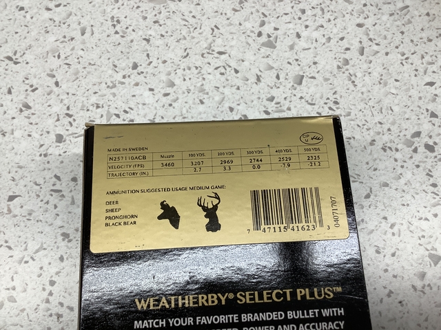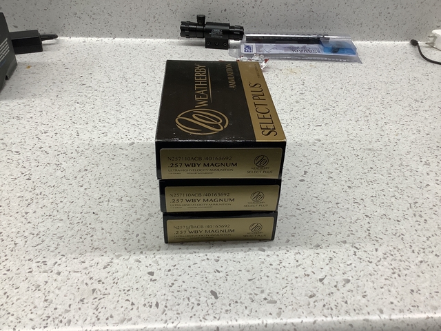 For sale are 3 boxes of Weatherby Select Plus ammunition in .257 Weatherby Magnum. Loaded with Nosler 110gr Accubond bullets. Must be over 18 years to buy. Shipping available with buyer paying the cost.