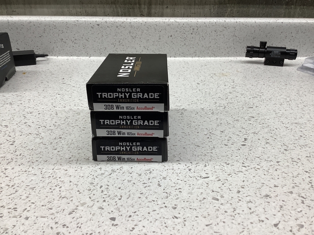 For Sale are 3 boxes of Nosler Trophy Grade 308 Winchester Ammunition. They are loaded with 165 gr Nosler Accubond bullets. Must be 18 or over to buy. Shipping available with buyer paying shipping.