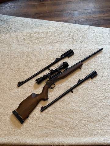 Rossi wizzard rifle. Three barrels, 223, 243 and 45-70. Very little use. Has a Tasco 3x9 scope. First $350 take it all. If its listed, its available.