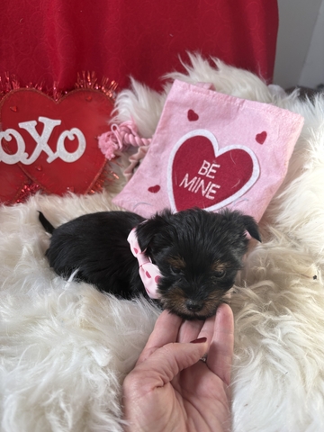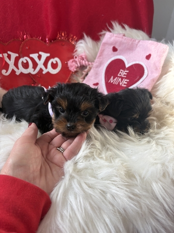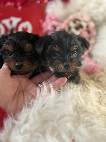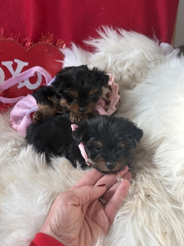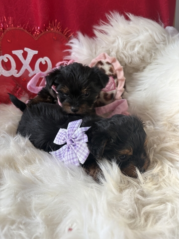 I have two super sweet little female Yorkies.. they are going to be ready for their new homes in about 2 to 3 weeks so mid too late February! Mom is a full Yorkie and dad is a Yorkie and poodle. These little girls will be small. I would say 6 pounds or under. Please text or call with any questions. I'm reserving the puppies for a $200 deposit