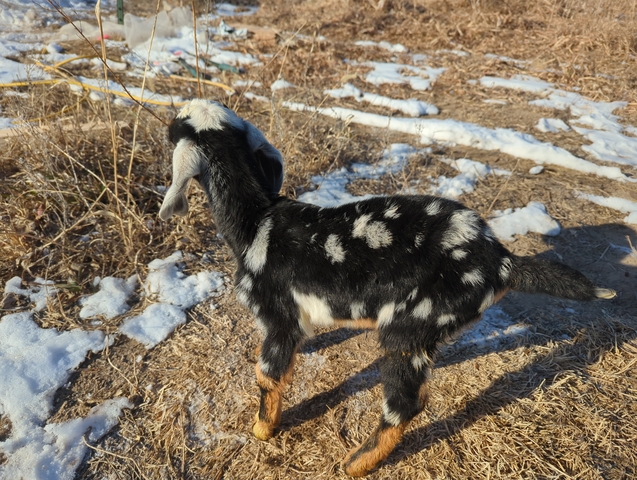 Pure Nubian, so he will be a full size goat. Bottle baby from heavy milking mom. He is part of triplets. He is good, I just have too many. Text 6 zero 2-33 four-six 883 and I will call you back.