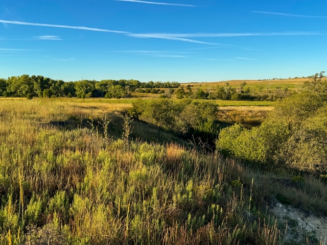 Creekside tall grasses support upland birds, with young cedars scattered across terraced bluestem grassland
