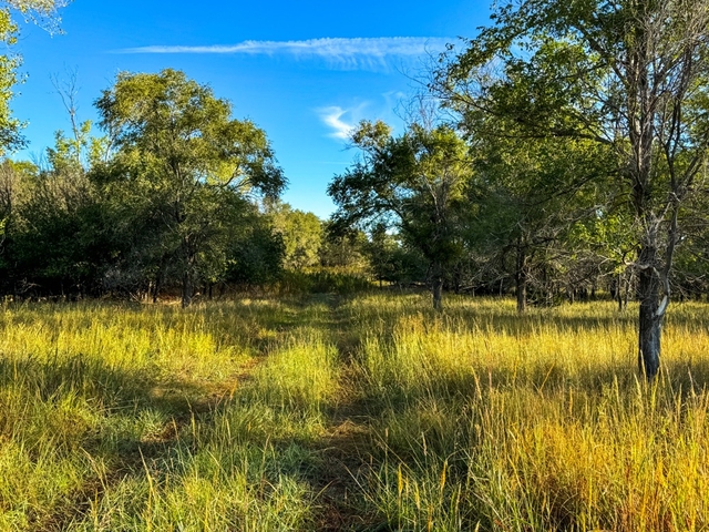 Large cottonwoods, mature cedars, and multiple other tree varieties along the creek bed