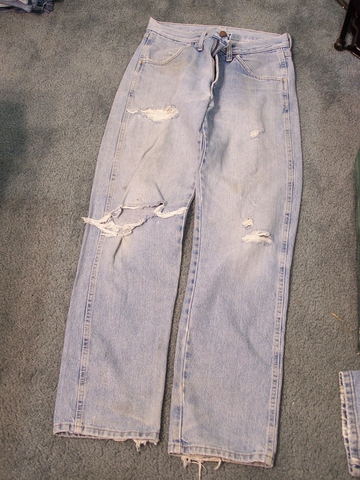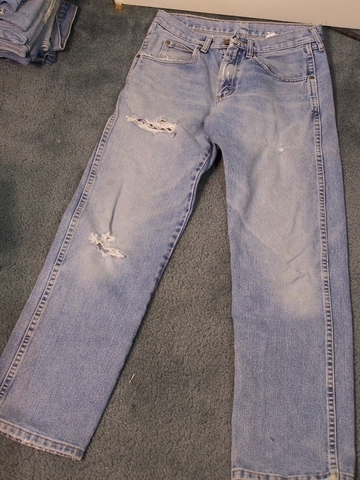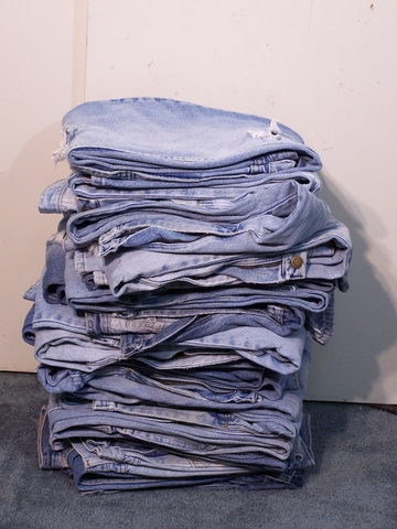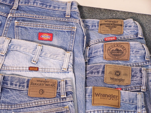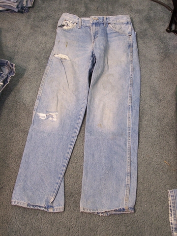 Here is a stack of old, worn, distressed, thrashed blue jeans. They all have the same pattern of wear and holes. I am almost positive they are all size 30 x 32. 19 pairs total... 10 wrangler, 6 Rustler, 3 Dickie.