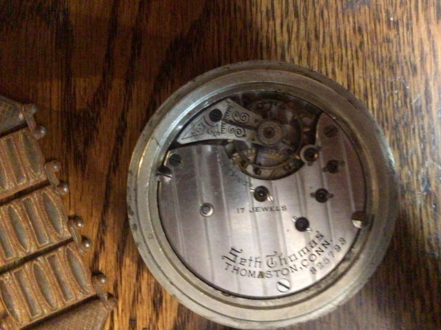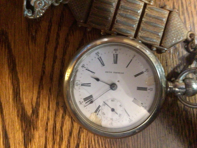 Seth Thomas pocket watch. With old fob. Glass crystal. Face has been damaged and repaired in two places. I can lightly jar the watch and it will run a few seconds. Just needs cleaning? $70. Contact me here or at: six two 0792 five 498. Keep trying, I'm sometimes hard to get. Cash only. No checks, no texts, no delivery.
