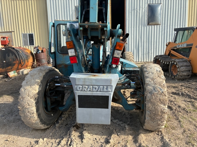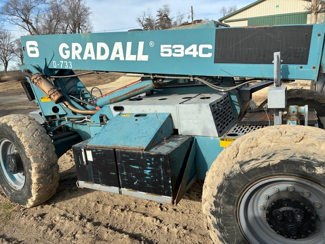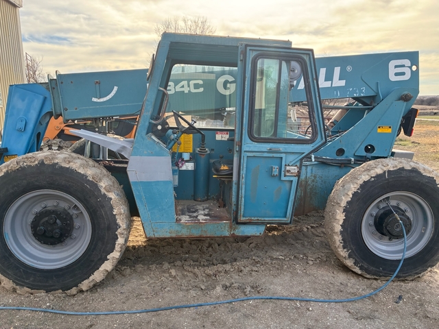 Gradall telehandler model 534C. Cab with heat. 6000 lb lift, 36' reach. Quick attach forks and bucket. Has frame leveling. 4 cylinder Cummins diesel motor. Runs excellent.
