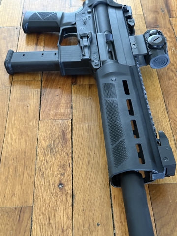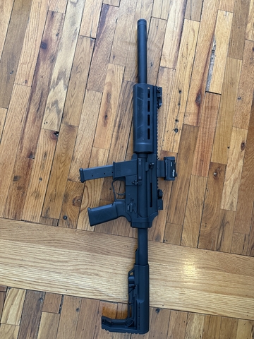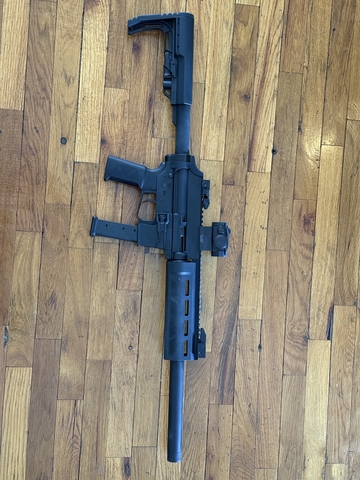 Comes with 4 mags (takes Glock mags), extar carrying case. Doesn't come with the optic for this price, but could be negotiated. Honest Outlaw does a great review on these on YouTube. It's great but I have another PCC and should let this one go. This is completely compatible with AR grips and Stocks As well as AR triggers. Has standard AR15 controls, but is its own thing and not completely an AR. Made in the USA.