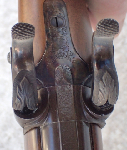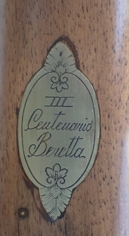 Markings: The hammers, lock plates, and stock bands have scrollwork. The bottom of the stock has a decorative inlay marked “III Centenario Beretta”. The top of the barrel is marked “1680 PIETRO BERETTA GARDONE 1980”. The right side of the barrel is marked “12 GA. -BLACK POWDER ONLY – MADE IN ITALY
