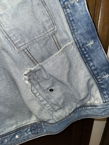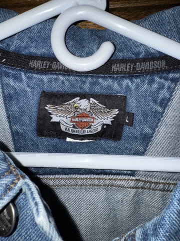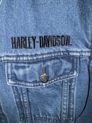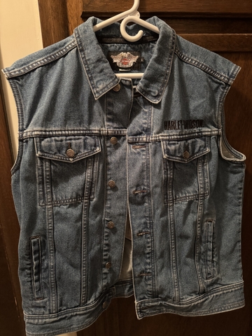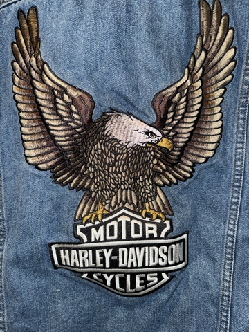 Here is a Large H-D denim vest with Eagle patch on back. The patch is very stiff but definitely solid and clean. It has inside pocket on both sides, and external pockets have snap closure. Cash sale only, $15. In-person only, in Hays. Fridays and Saturdays are best for me.