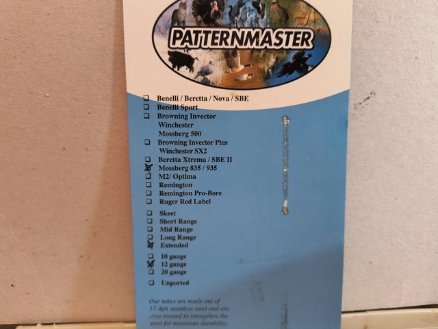 Here is a Patternmaster Extended range choke tube for a Mossberg 835/935 shotgun. Brand new, never used.